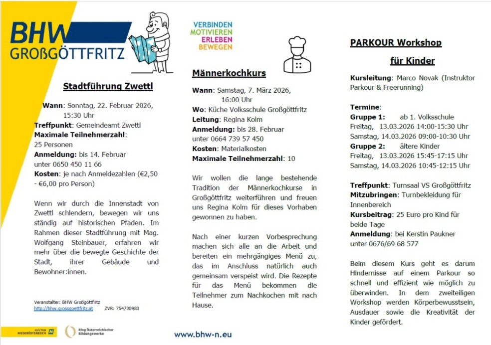 Kindermaskenfest Theater: Der Zwitter Damenturnen Kreuzstich - Nähkurs Ausflug in die Steiermark Seniorenausflug Marterlwanderung Ausstellung: Alte Geräte in Haus und Hof Volksliedforschung ÖSTA Erntedankfest Impressionen einer Nordlandreise Offenes Singen Heilkräuter und deine Gesundheit Schönes Bauen in Niederösterreich Alternativkulturen im Waldviertel Schulfachmann Das Kind in kranken und gesunden Tagen Energie sinnvoll verwenden Damenturnen! Turnen für Damen und Herren